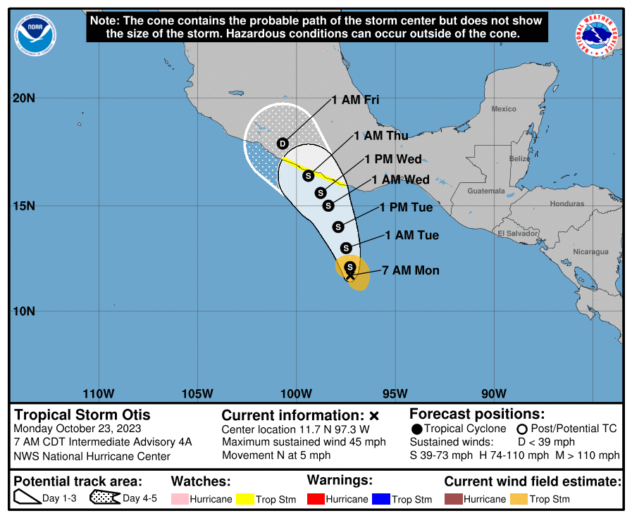 A tropical disturbance south of Mexico organized into Tropical Storm Otis over the eastern Pacific Ocean. Forecasts initially projected a relatively weak storm that would remain offshore or make landfall at low intensity.